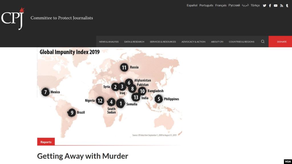 Trembëdhjetë vende përfshijnë më shumë se tre të katërtat e të gjitha vrasjeve të pazgjidhura të gazetarëve në nivel global. Lista kryesohet nga Somalia për të pestin vit me radhë. Vendi, i cili po lufton terroristët e grupit militant al-Shabaab, ka 25 vrasje të pazgjidhura të gazetarëve.