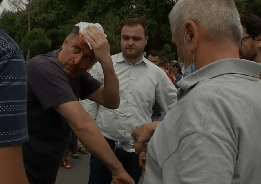 Një person i gjakosur mes protestuesve në mbrojtje të Teatrit. Një burrë në moshë ka marrë një plagë në kokë me sa duket gjatë përleshjes me policinë dhe ka pësuar një çarje në kokë.