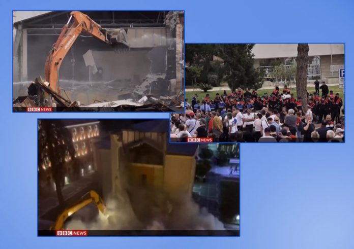 “Shkatërrimi i Teatrit Kombëtar në kryeqytetin e Shqipërisë, Tiranë ka çuar në përplasje të rënda midis protestuesve dhe policisë. Aktivistë dhe aktorë u tërhoqën zvarrë nga policia teksa godina 81 vjeçare u sheshua e tëra”, shprehet spikeri i BBC.