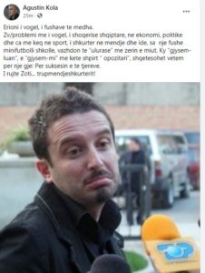 “Erioni i vogël, i fushave të mëdha. Zv/problemi më i vogël, i shoqërisë shqiptare, në ekonomi, politikë dhe ca më keq në sport, i shkurtër në mendje dhe ide, sa një fushë minifutbolli shkolle, vazhdon të “ulurasë” me zërin e miut. Ky “gjysëm-luan”, e “gjysëm-mi” me këtë shpirt “opozitari”, shqetësohet vetëm për një gjë: Për suksesin e të tjerëve. I ruajtë Zoti… trupmendjeshkurtërit!”, shkruan Agustin Kola në llogarinë e tij në “Facebook”.