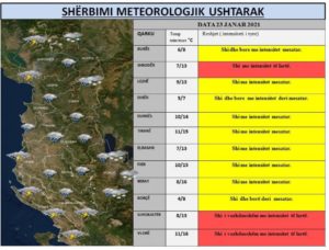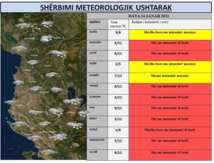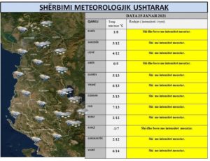 Reshjet e shiut do të jenë prezente të herëpashershme gjatë gjithë këtyre ditëve, por për tu theksuar mbetet zona veriperëndimore dhe ajo jugore ku reshjet do të jenë intensive në intervale kohore nga 6 deri në 12 orë, bën të ditur Shërbimi Meteorologjik Ushtarak.