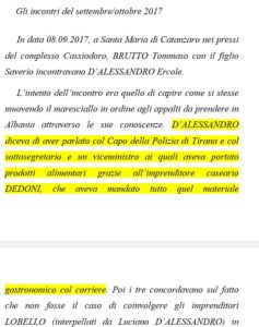 Në bisedë, D’alessandro thotë se foli me “Shefin e Policisë së Tiranës, një zyrtar i lartë dhe një zv/ministër, të cilit i solli dy sopresata, mish derri dhe djathë me ndihmën e Dedonit, i cili dërgoi gjithçka me korrier”.