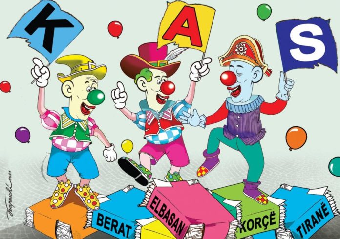 Kurse mjeshtri Bujar Kapexhiu, në një punim për gazetën MAPO, ka thumbuar KAS për qëndrimet e tyre, duke i paraqitur si klounë.