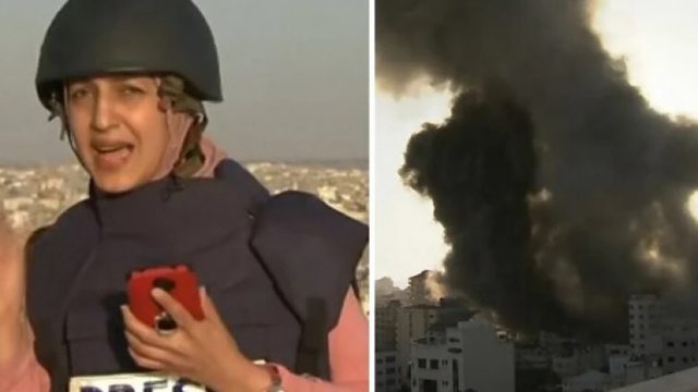Gazetarja e Al Jazeera, Youmna Al Sayed raportoi drejtpërdrejt nga një çati në Gaza kur një sulm ajror izraelit shkatërroi një ndërtesë 14-katëshe përballë saj.