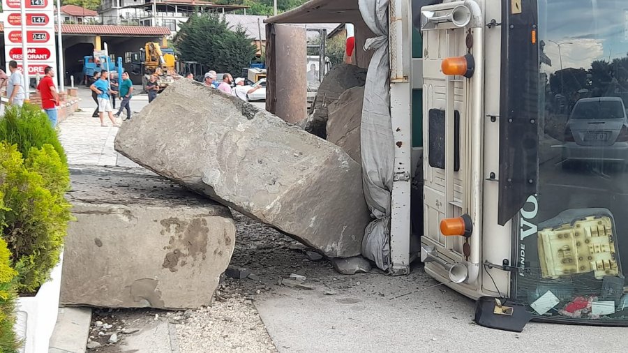 Një kamion i ngarkuar me gurë raportohet se ka humbur kontrrollin edhe është rrokullisur