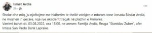 “Shoke dhe miq, ju njoftojme me hidherim te thellë vdekjen e mbeses tone Jonada Bledar Avdia, ne moshen 7 vjecare, nga nje aksident tragjik në plazhin e Himares. Varrimi bahet dt. 03.08.2022, ora 15:00, ne adresen: Familja Avdia, Rruga “Stanislav Zuber”, afer Intesa San Paolo Bank Laprake” shkruan Ismet Avdia.