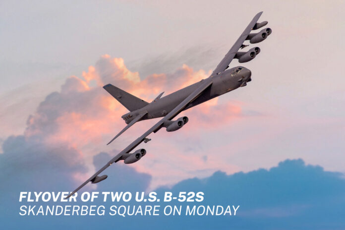 Dy avionë amerikanë B-52, bombardues do të fluturojnë në qiell mbi Sheshin Skënderbej të hënën, më 22 gusht.