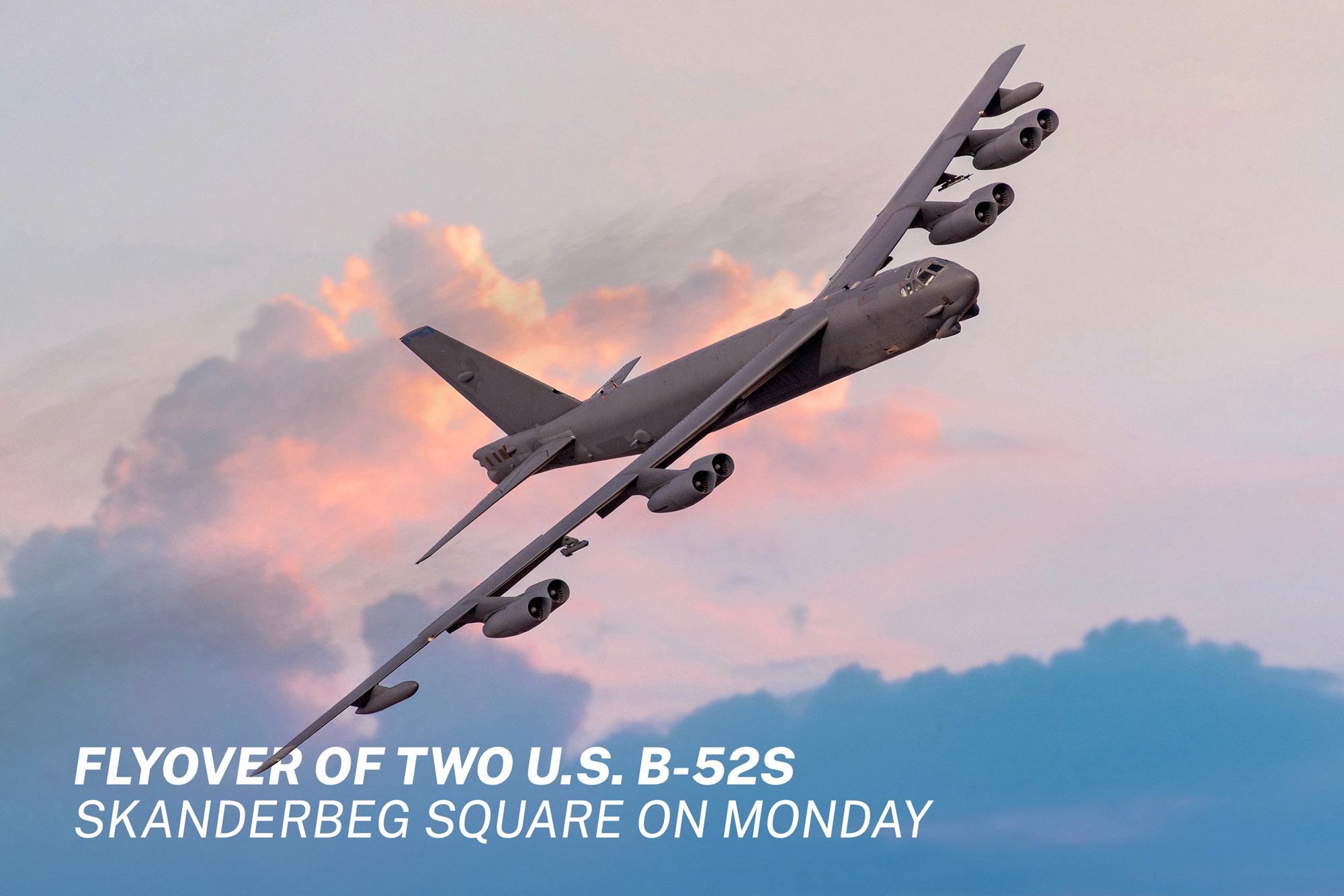 Nderoni drejt qiellit këtë të hënë! Të rritur dhe fëmijë, mos humbisni një shfaqje të mahnitshme ushtarake dhe ejani të shihni fluturimin e dy avionëve amerikanë B-52 nga sheshi Skënderbej të hënën, më 22 gusht.