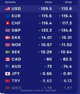 Sot një dollar amerikan blihet me 109.5 lekë dhe shitet me 110.8 lekë. Ndërsa euro blihet me 115.6 dhe shitet me 116.4 lekë.