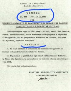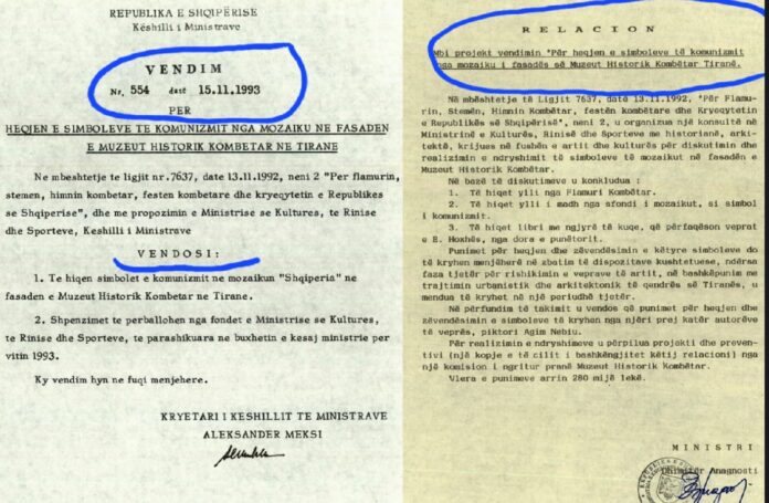 -Mbi këtë bazë, Këshilli i Ministrave mori vendimin nr.554, datë 15.11.1993 “Për heqjen e simboleve të komunizmit nga mozaiku në fasadën e Muzeut Historik Kombëtar në Tiranë”, i përbërë nga dy nene.