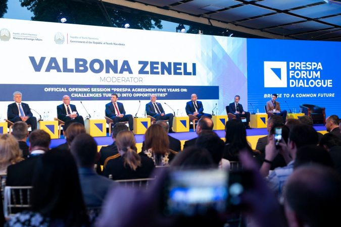 Fare pranë skenës që u rrëzua ishte Valbona Zeneli, Profesoreshë e Studimeve të Sigurisë Kombëtare dhe Drejtuese e Departamentit për Iniciativat Strategjike në Qendrën Europiane George C. Marshall për Studimet e Sigurisë, e cila ishte edhe moderatorja e sesionit hapës të Forumit të Prespës me personalitete të larta.