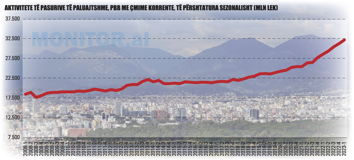 Të dhënat e publikuara nga INSTAT bëjnë të ditur se prodhimi i brendshëm bruto me çmime korente në aktivitetin e pasurive të paluajtshme, që mat vlerën e transaksioneve ekonomike në këtë sektor, arriti në 32.3 miliardë lekë, ose gati 300 milionë euro në tre muajt e parë të vitit.