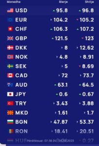 Në tregun e këmbimit valutor sot një dollar amerikan blihet me 95.8 lekë dhe shitet me 96.8 lekë. Monedha evropiane euro do të blihet me 104.2 lekë dhe do shitet me 105.2 lekë. Ndërkohë franga zvicerane do blihet me 106.3 lekë dhe do shitet me 107.2 lekë, ndërsa paundi britanik do blihet me 121.5 lekë dhe do shitet me 123 lekë.