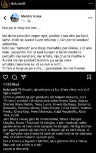 Keto soj “lajmesh” jane lloqe mediatike per klikime, e di une kete, padyshim. Por si keni kurajen o bicim media te perballni nje kengtare, nje artiste, nje grua te madhe si Aurela me nje produkt televiziv pa asnje vlere artistike (njerezore se, di se nuk e njoh). Yt fare e keqe se po e dhi…. gazetarine deri ne themel”, shkroi Menton Kika.