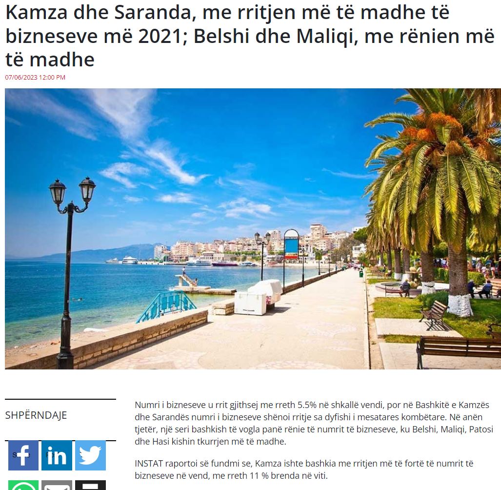 Kampione e rritjes së numrit të bizneseve në 2011/Shifrat zyrrae të INSTAT tregojnë se numri i bizneseve u rrit gjithsej me rreth 5.5% në shkallë vendi, por në Bashkitë e Kamzës dhe Sarandës numri i bizneseve shënoi rritje sa dyfishi i mesatares kombëtare. Në anën tjetër, një sërë bashkishë patën rënie të numrit të bizneseve INSTAT raportoi se, Kamza ishte bashkia me rritjen më të fortë të numrit të bizneseve në vend, me rreth 11 % brenda në viti. Me një popullsi të re në moshë afër kryeqytetit, Portit të Durrësit, Kamza duket se është bërë tërheqëse për bizneset. Kamza që është një ndër bashkitë më të mëdha për nga numri i popullsisë, raportoi rreth 3327 biznese në territorin e saj në vitin 2022, nga 2998 që ishin më 2021”. https://www.monitor.al/kamza-dhe-saranda-me-rritjen-me-te-madhe-te-bizneseve-me-2021-belshi-dhe-maliqi-me-renien-me-te-madhe/