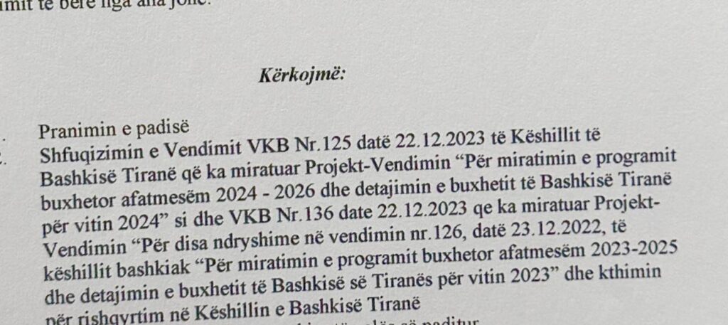 Shfuqizimin e VKB Nr.125 datë 22.12.2023 të Këshillit të Bashkisë Tiranë që ka miratuar Projekt-Vendimin e “Për miratimin e programit buxhetor afatmesëm 2024 – 2026 dhe detajimin e buxhetit të Bashkisë Tiranë për vitin 2024” si dhe VKB Nr. 136 datë 22.12.2023 qe ka miratuar Projekt-Vendimin “Për disa ndryshime në vendimin nr.126, datë 23.12.2022, të këshillit bashkiak “Për miratimin e programit buxhetor afatmesëm 2023-2025 dhe detajimin e buxhetit të Bashkisë së Tiranës për vitin 2023” duke bere kthimin për rishqyrtim në Këshillin e Bashkisë Tiranë.
