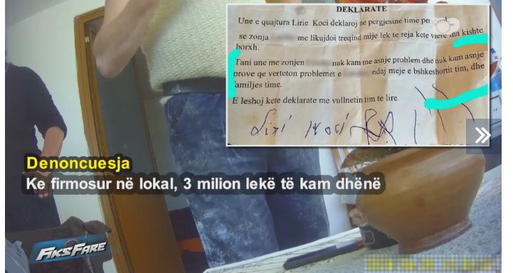 Qytetarja e shantazhuar ju dha gazetarëve të Fiksit një deklaratë, që gruaja e policit kishte firmosur në të cilën thuhej se denoncuesja i ka dhënë 3 milionë lekë se jua kishte borxh dhe po në të njëjtën deklaratë, gruaja e policit , Liri Koçi thotë se nga ai moment nuk ka më prova se qytetarja ka lidhje me të shoqin. Kështu ata deklaruan se paratë i morën për atë që qytetarja pretendoi në emisionin investigative.