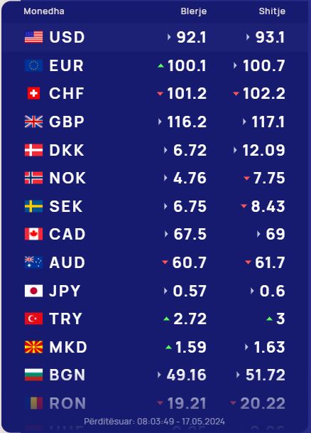 Në tregun e këmbimit valutor shqiptar sot një dollar do blihet me 92.1 lekë dhe do shitet me 93.1 lekë. Ndërkohë monedha evropiane euro do blihet me 100.1 lekë dhe do shitet me 100.7 lekë. Franga zvicerane sot në tregun shqiptar do blihet me 101.2 lekë dhe do shitet me 102.2 lekë. Ndërsa paundi britanik do blihet me 116.2 lekë dhe do shitet me 117.1 lekë.