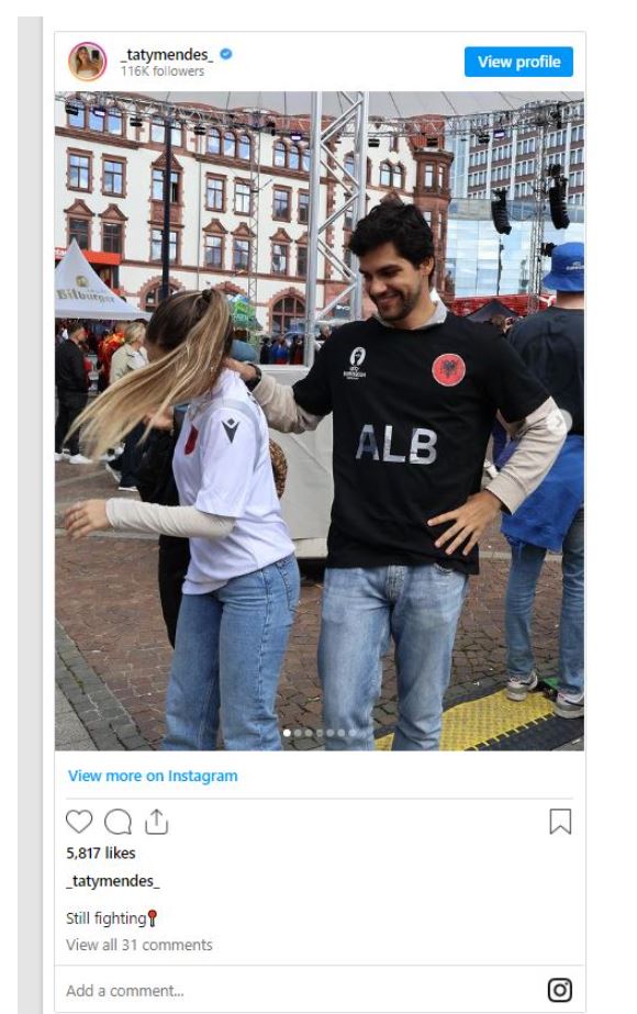 Tati ishte e shoqëruar edhe nga partneri i saj dhe të tre mbanin veshur fanellat e Kombëtares. Ajo ka publikuar disa foto me mbishkrim: Akoma luftojmë!