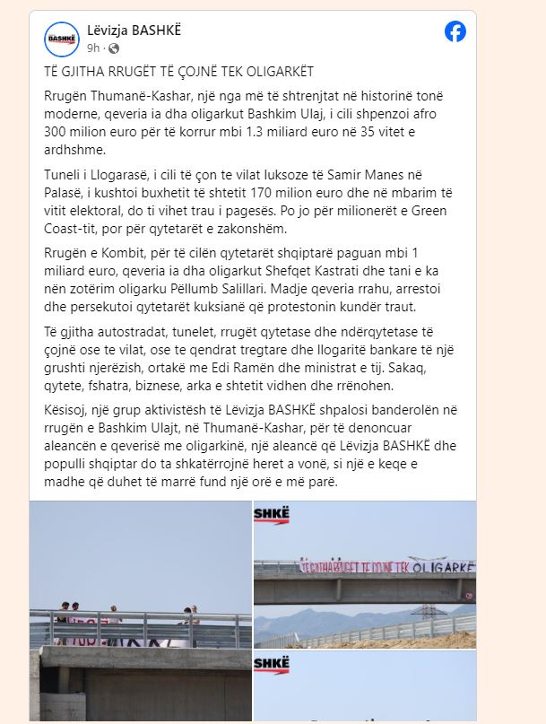 Me banderolën “Të gjitha rrugët të çojnë tek oligarkët”, aktivistët e “Lëvizja Bashkë” protestuan sot te rruga Thumanë-Kashar, e cila u hap pak javë ma parë dhe që do të jetë me pagesë. Sipas aktivistëve rrugën Thumanë-Kashar, një nga më të shtrenjtat në historinë tonë moderne, qeveria ia dha oligarkut Bashkim Ulaj, i cili shpenzoi afro 300 milionë euro për të korrur mbi 1.3 miliard euro në 35 vitet e ardhshme. “Lëvizja Bashkë” renditi edhe koncesionet e tjera që iu janë dhënë oligarkëve të tjerë, e që rëndojnë mbi qytetarët.