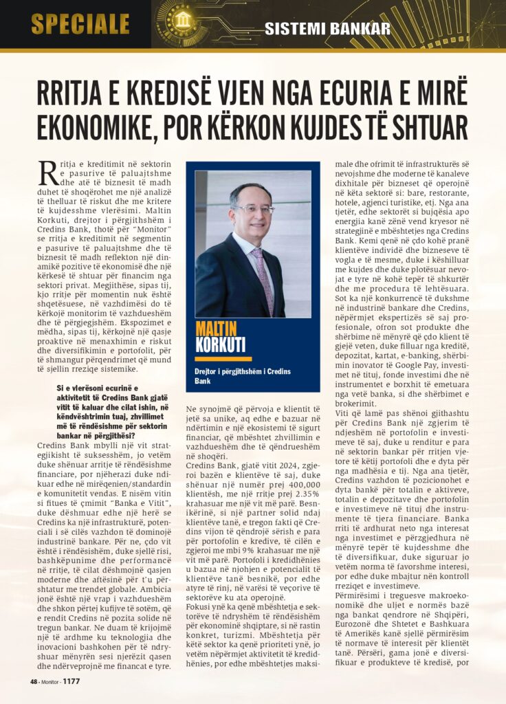 Drejtor i Përgjithshëm i Credins Bank z.Maltin Kërkuti, në një intervistë ekskluzive për revistën Monitor. Zoti Korkuti është shprehur se viti 2024 ishte një vit i suksesshëm për Credins Bank, duke i dhënë prioritet sektorëve me rëndësi për ekonominë e vendit, si: turizmi, bujqësia, energjia etj.