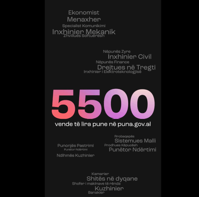 Ministri i Ekonomisë, Kulturës dhe Inovacionit, Blendi Gonxhja, ka bërë me dije në një postim në rrjetet sociale se, janë të hapura mbi 5500 vende të lira pune, për çdo individ që dëshiron të nisë një rrugëtim të ri profesional.