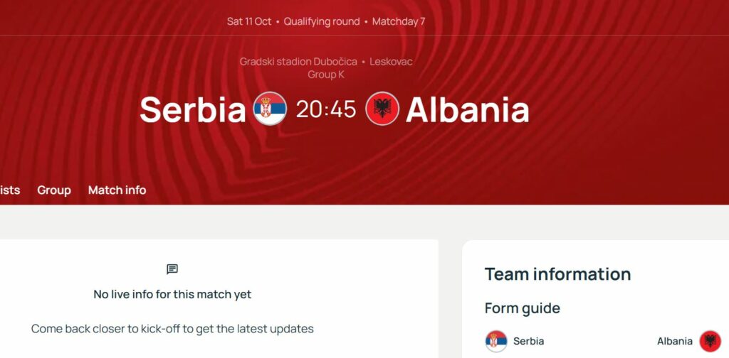 Ishte vetë Federata Serbe e cila kishte kërkuar që ky duel të spostohej nga Beogradi, kjo për shkak të çështjes së sigurisë. Gjithashtu, pritet që të jepet dhe vendimi sa i përket mungesës së tifozëve në këtë takim, kjo pas sjelljes së turpshme që tifozeria serbe tregoi në duelin kundër Anglisë.