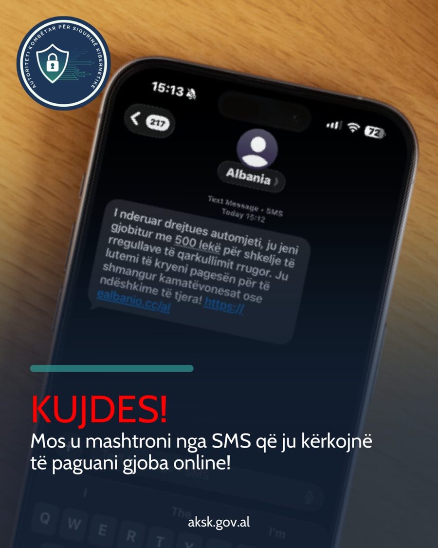 Autoriteti Kombëtar për Sigurinë Kibernetike (AKSK) ka njoftuar qytetarët për një fushatë mashtruese “smishing”, që po qarkullon përmes mesazheve telefonike. Mesazhi i rremë u kërkon qytetarëve të kryejnë pagesa online për gjoba të supozuara të qarkullimit rrugor, duke ofruar një link mashtrues.