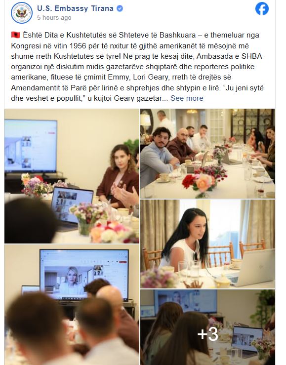 “Është Dita e Kushtetutës së Shteteve të Bashkuara – e themeluar nga Kongresi në vitin 1956 për të nxitur të gjithë amerikanët të mësojnë më shumë rreth Kushtetutës së tyre! Në prag të kësaj dite, Ambasada e SHBA organizoi një diskutim midis gazetarëve shqiptarë dhe reporteres politike amerikane, fituese të çmimit Emmy, Lori Geary, rreth të drejtës së Amendamentit të Parë për lirinë e shprehjes dhe shtypin e lirë. “Ju jeni sytë dhe veshët e popullit”, shkruan ambasada amerikane.