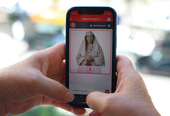Foto: Një grua përdor portalin qeveritar shqiptar e-Albania, i ndihmuar aktualisht nga avatari i ministres së kabinetit të inteligjencës artificiale të qeverisë Diella, në Tiranë më 12 shtator (Adnan Beci/AFP/Getty Images)