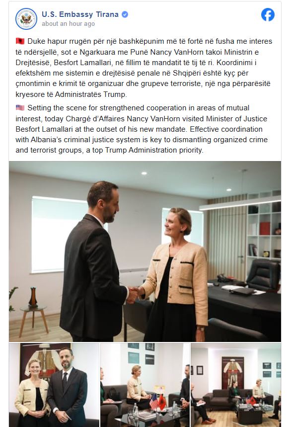 Ambasada e Shteteve të Bashkuara në Tiranë ka reaguar pas takimit të të Ngarkuarës me Punë, Nancy VanHorn me Ministrin e Drejtësisë, Besfort Lamallari, në nisje të mandatit të tij të ri.