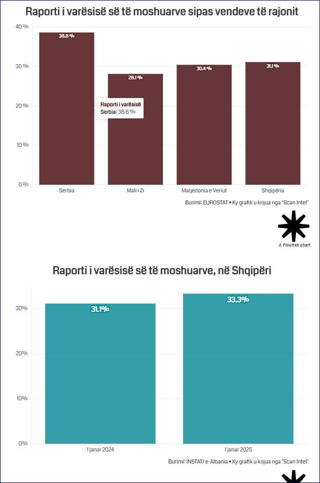 Në BE, më 1 janar 2024, raporti ishte 37%, duke treguar se kishte më pak se 3 të rritur në moshë pune për çdo person të moshuar. Mirëpo, si paraqiten këto të dhëna për Shqipërinë? Më 1 janar 2024, raporti i varësisë së të moshuarve ishte 31.1%. Sipas të dhënave të INSTAT, ky raport u rrit në janarin e këtij viti, duke arritur në 33.3%, duke u afruar më shumë me mesataren e BE-së. Por si paraqiten të dhënat për vitin 2024 në krahasim me Shqipërinë dhe vendet e tjera të rajonit dhe Europës?