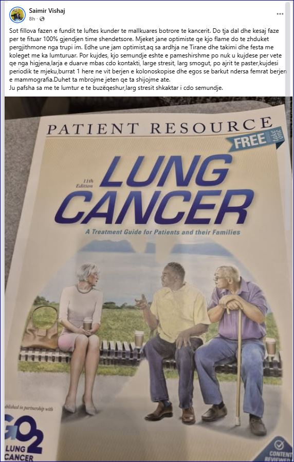 “Sot fillova fazën e fundit të luftës kundër të mallkuarës botërore te kancerit. Do t’ia dal dhe kësaj faze për të fituar 100% gjendjen time shëndetësore. Mjekët janë optimiste që kjo flamë do të zhduket përgjithmonë nga trupi im. Edhe unë jam optimist, aq sa ardhja në Tiranë dhe takimi dhe festa me kolegët më ka lumturuar.