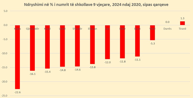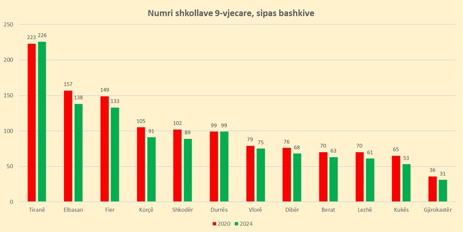 Në anën tjetër, Tirana mbetet zona më e qëndrueshme, ku numri i shkollave në ciklin 9- vjeçar është shtuar me tre nga 2020 në 2024, duke reflektuar rritjen demografike dhe përqendrimin e popullsisë në kryeqytet.