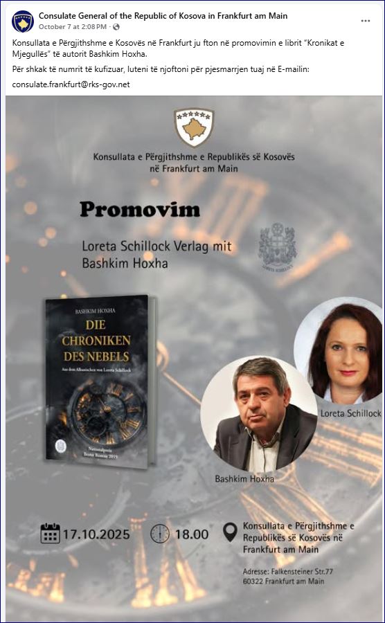 Konsullata e Përgjithshme e Kosovës në Frankfurt ju fton në promovimin e librit “Kronikat e Mjegullës” të autorit Bashkim Hoxha.