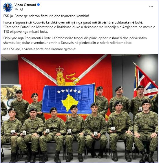 “FSK-ja, Forcë që nderon flamurin dhe frymëzon kombin! Forca e Sigurisë së Kosovës ka shkëlqyer në një nga garat më të vështira ushtarake në botë, ‘Cambrian Patrol’ në Mbretërinë e Bashkuar, duke u dekoruar me Medaljen e Argjendtë në mesin e 118 ekipeve nga mbarë bota,” ka shkruar Osmani në rrjetin social në Facebook.