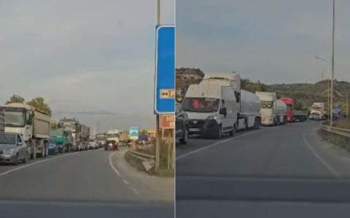 Trafik në aksin Durrës-Tiranë dhe radhë të gjata mjetesh, duke penguar qarkullimin për shkak të bllokimit të autostradës.