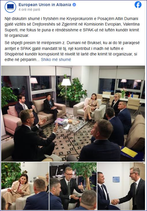 “Së shpejti presim të mirëpresim z. Dumani në Bruksel, ku ai do të paraqesë arritjet e SPAK gjatë mandatit të tij, një kontribut i madh në luftën e Shqipërisë kundër korrupsionit të nivelit të lartë dhe krimit të organizuar, si edhe në përparimin e vendit në rrugën e anëtarësimit në BE”.