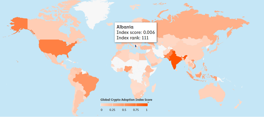 Raporti i Chainalysis mbi gjeografinë e kriptovalutave 2025, përmban një indeks, që mat adoptimin e kriptovalutave në 151 shtete të botës. Por, ku renditet Shqipëria? Në vendin e 111-të në botë, sipas raportit të vitit 2025, nga vendi i 109-të që ishtë një vit më parë. Krahasuar me rajonin ndërkohë, Shqipëria është e fundit në renditje, pas Serbisë, që mban vendin e 67-të, Bosnje Hercegovinës që mban vendin e 97 dhe Malit të Zi, i cili renditet në vend të 104-t.