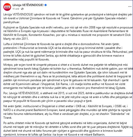 Lëvizja Vetëvendosje më paska kushtuar një çarçaf të gjatë, ku shkruan se përpara 10 vjetësh unë paskam qenë pro kurse ajo paska qenë kundër Gjykatës Speciale… Ndërkohë unë e kam denoncuar farsën ndaj Hashim Thaçit e të tjerëve kurdo e kudo ka qenë rasti a nevoja, ndërsa Lëvizja dihet se sa ka lëvizur në atë drejtim. Por unë s’jam në asnjë lloj gare me Lëvizjen dhe më vjen keq që Lëvizja i ngatërron marrëdhëniet institucionale të Kosovës me Shqipërinë në çorbën e balotazheve komunale, ndërsa për qëndrimet e para 10 vjetëve – kur ajo nuk njihte as himnin e Kosovës e jo më pafajësinë e Hashim Thaçit, të cilin do ta donte përjetësisht në Hagë – i kujtoj Lëvizjes se Gjykata Speciale u ngrit për trafikun e organeve, jo për të marrë peng Presidentin e Republikës së Kosovës. Dhe e fundit, unë as nuk jam organizator e as nuk jam folës i protestës gjithëkombëtare “Drejtësi për Çlirimtarët”, të cilën e mbështes megjithë zemër e do t’i bashkohesha si pjesëmarrës i thjeshtë, nëse nuk do të isha i vetëdijshëm se çdo politizim me dashje ose jo i asaj nisme, do të dëmtonte qëllimin dhe popullaritetin e saj.