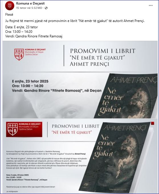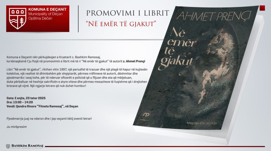 Botimet e shkrimtarit Ahmet Prençi vazhdojnë të njohin suksesin dhe matësi për të konfirmuar një gjë të tillë, është përqafimi nga ana e lexuesit e veprave të tij romaneve, por dhe vëllimit më tregime sjellë së fundmi të titulluar ”Në emër të gjakut”. Në vijim të takimeve dhe promovimeve, radha është në Kosovë, ku autori dhe kryetari i Komunës Bashkim Ramosaj konfirmojnë promovimin e këtij libri. “Një ngjarje e bukur për mua. Rast i çmuar për tu pare e takuar me miq e lexues. Faleminderit Komuna e Deçanit”- shkruan autori Ahmet Prençi në Facebook!