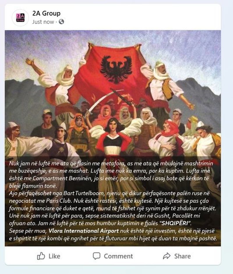 Sepse për mua, Vlora International Airport nuk është një investim, është një pjesë e shpirtit të një kombi që ngrihet për të fluturuar mbi hijet që duan ta mbajnë poshtë.” – thuhet në njoftimin e 2A Group.