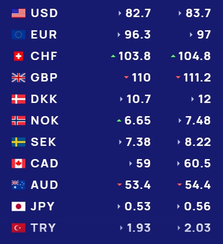 Në tregun e këmbimit valutor shqiptar, një dollar amerikan do të blihet sot me 82.7 lekë dhe do shitet me 83.78 lekë. Ndërkohë monedha evropiane euro do blihet me 96.3 lekë dhe do shitet me 97 lekë. Franga zvicerane sot në tregun shqiptar do blihet me 103.8 lekë dhe do shitet me 104.8 lekë. Ndërsa paundi britanik do blihet me 110 lekë dhe do shitet me 111.2 lekë.