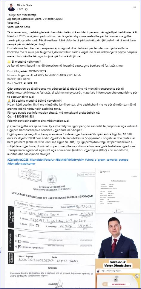Kandidati i pavarur për bashkinë e Vlorës, i mbështetur edhe nga Partia Demokratike, Dionis Sota përmes një njoftimi në rrjetet sociale, ka kërkuar mbështetjen e qytetarëve përmes financimeve për fushatën e tij për zgjedhjet e 9 nëntorit.