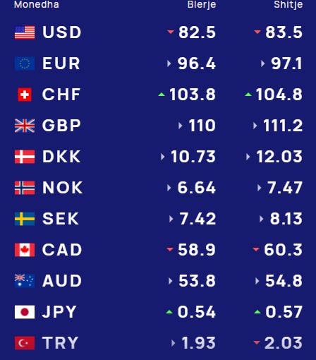 Në tregun e këmbimit valutor shqiptar, një dollar amerikan do të blihet sot me 82.5 lekë dhe do shitet me 83.5 lekë. Ndërkohë monedha evropiane euro do blihet me 96.4 lekë dhe do shitet me 97.1 lekë Franga zvicerane sot në tregun shqiptar do blihet me 103.8 lekë dhe do shitet me 104.8 lekë. Ndërsa paundi britanik do blihet me 110 lekë dhe do shitet me 111.2 lekë.