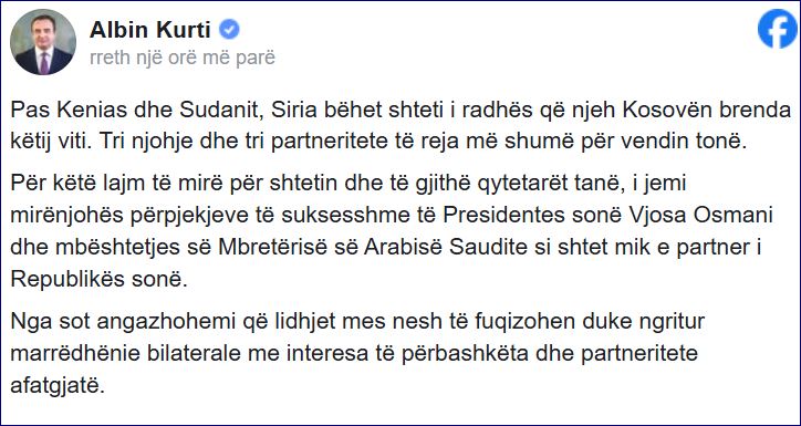 “Pas Kenias dhe Sudanit, Siria bëhet shteti i radhës që njeh Kosovën brenda këtij viti. Tre njohje dhe tre partneritete të reja më shumë për vendin tonë,” ka deklaruar Kurti.