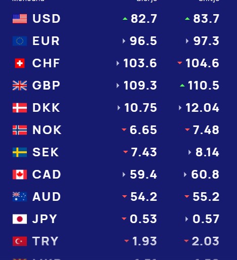 Në tregun e këmbimit valutor shqiptar, një dollar amerikan do të blihet sot me 82.7 lekë dhe do shitet me 83.7 lekë. Ndërkohë monedha evropiane euro do blihet me 96.5 lekë dhe do shitet me 97.3 lekë. Franga zvicerane sot në tregun shqiptar do blihet me 103.6 lekë dhe do shitet me 104.6 lekë. Ndërsa paundi britanik do blihet me 109.3 lekë dhe do shitet me 110.5 lekë.