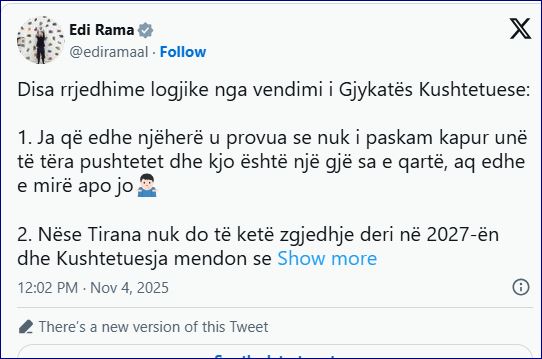 Në një postim në platformën “X”, Rama e cilësoi vendimin si dëshmi se ai nuk kontrollon të gjitha pushtetet, duke hedhur poshtë akuzat për kapje institucionale.