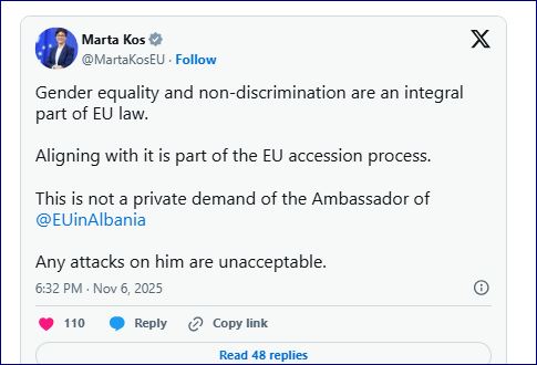 “Barazia gjinore dhe mosdiskriminimi janë pjesë integrale e ligjit të BE-së. Përputhja me të është pjesë e procesit të pranimit në BE. Kjo nuk është një kërkesë private e Ambasadorit të BE-së në Shqipëri. Çdo sulm ndaj tij është i papranueshëm”, shkroi Marta Kos.