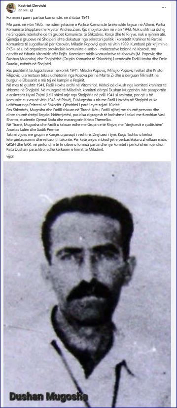 Në mes të gushtit 1941, Fadil Hoxha erdhi në Vitomiricë. Kërkoi që dikush nga komiteti krahinor të shkonte në Shqipëri. Në mungesë të Miladinit, komiteti dërgoi Dushan Mugoshën. Me pasaportën e arsimtarit Hysni Zajmi (i cili shkoi atje nga Shqipëria në prill 1941 si arsimtar, por që u bë komunist e u vra në vitin 1943 në Plavë), D.Mugosha u nis me Fadil Hoxhën në Shqipëri duke udhëtuar nga Prizreni në Shkodër. Qëndrimi i parë i tyre zgjati 10 ditë.